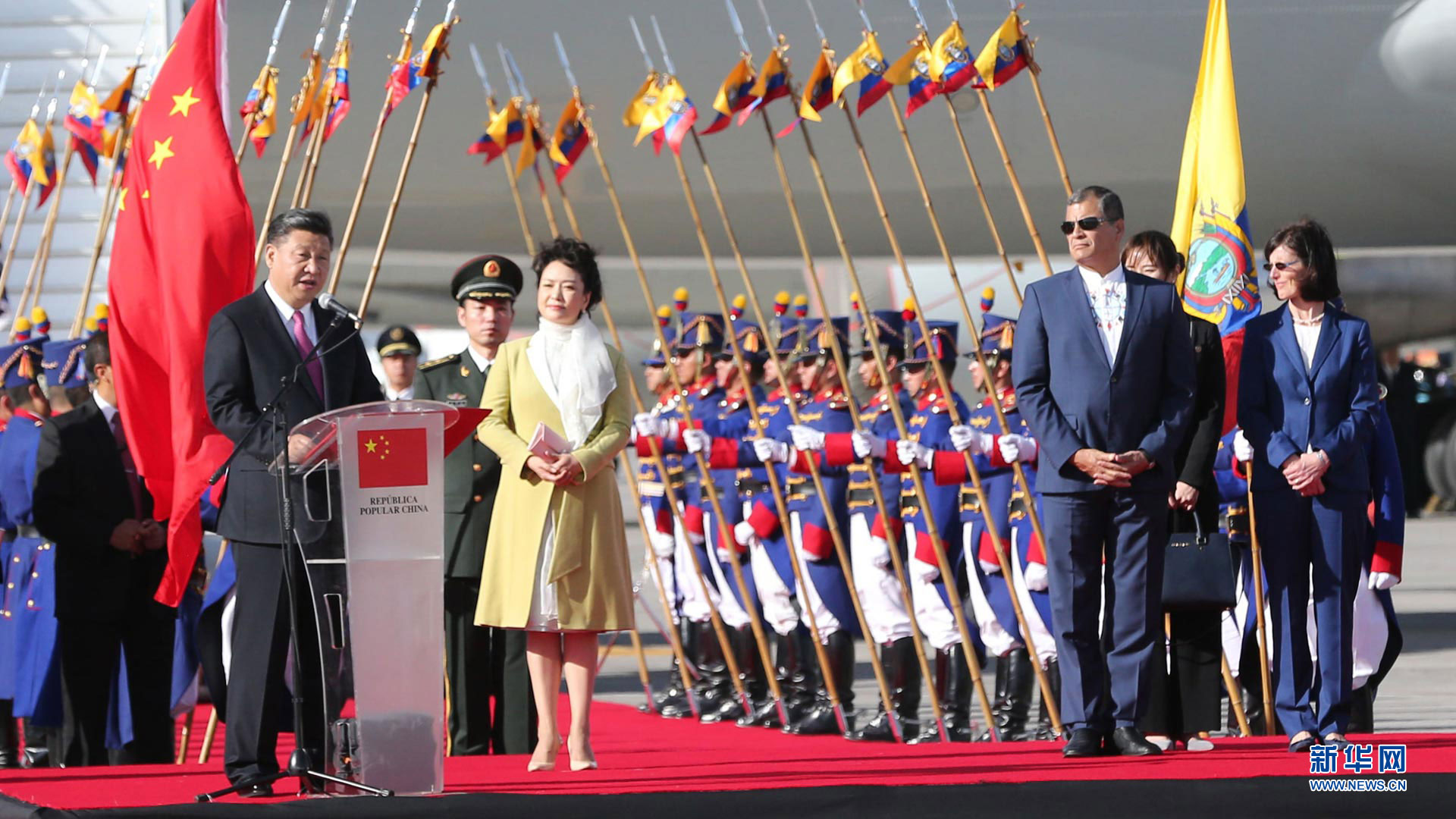 當地時間11月17日,國家主席習近平乘專機抵達基多,開始對厄瓜多爾共和國進行國事訪問。厄瓜多爾總統科雷亞和夫人馬勒布等在機場熱情迎接習近平和夫人彭麗媛。新華社記者 鞠鵬 攝2016-11-18