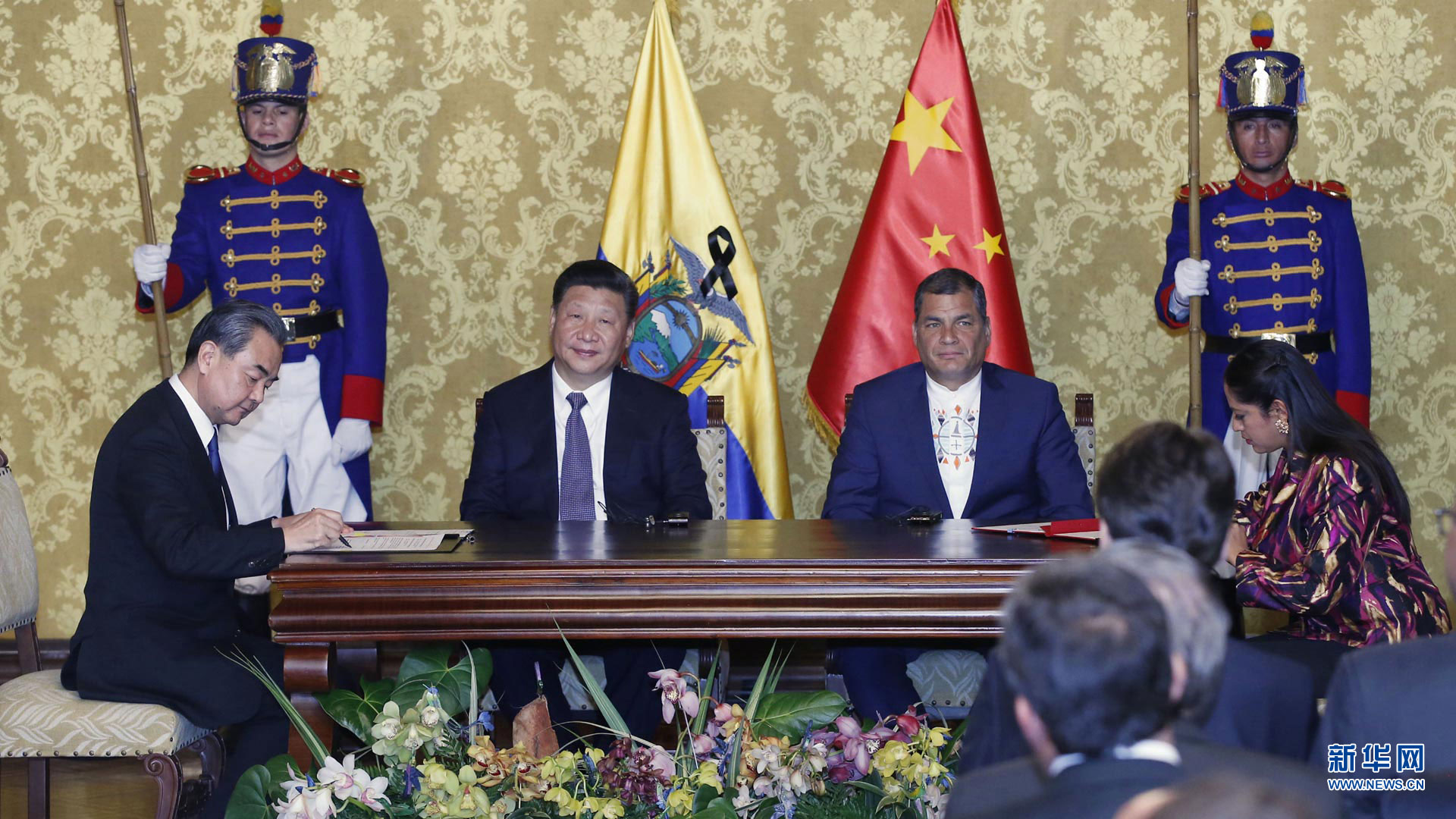 當地時間11月17日,國家主席習近平在基多同厄瓜多爾總統科雷亞舉行會談。這是會談后,兩國元首見證雙邊合作文件的簽署。 新華社記者 鞠鵬攝2016-11-18