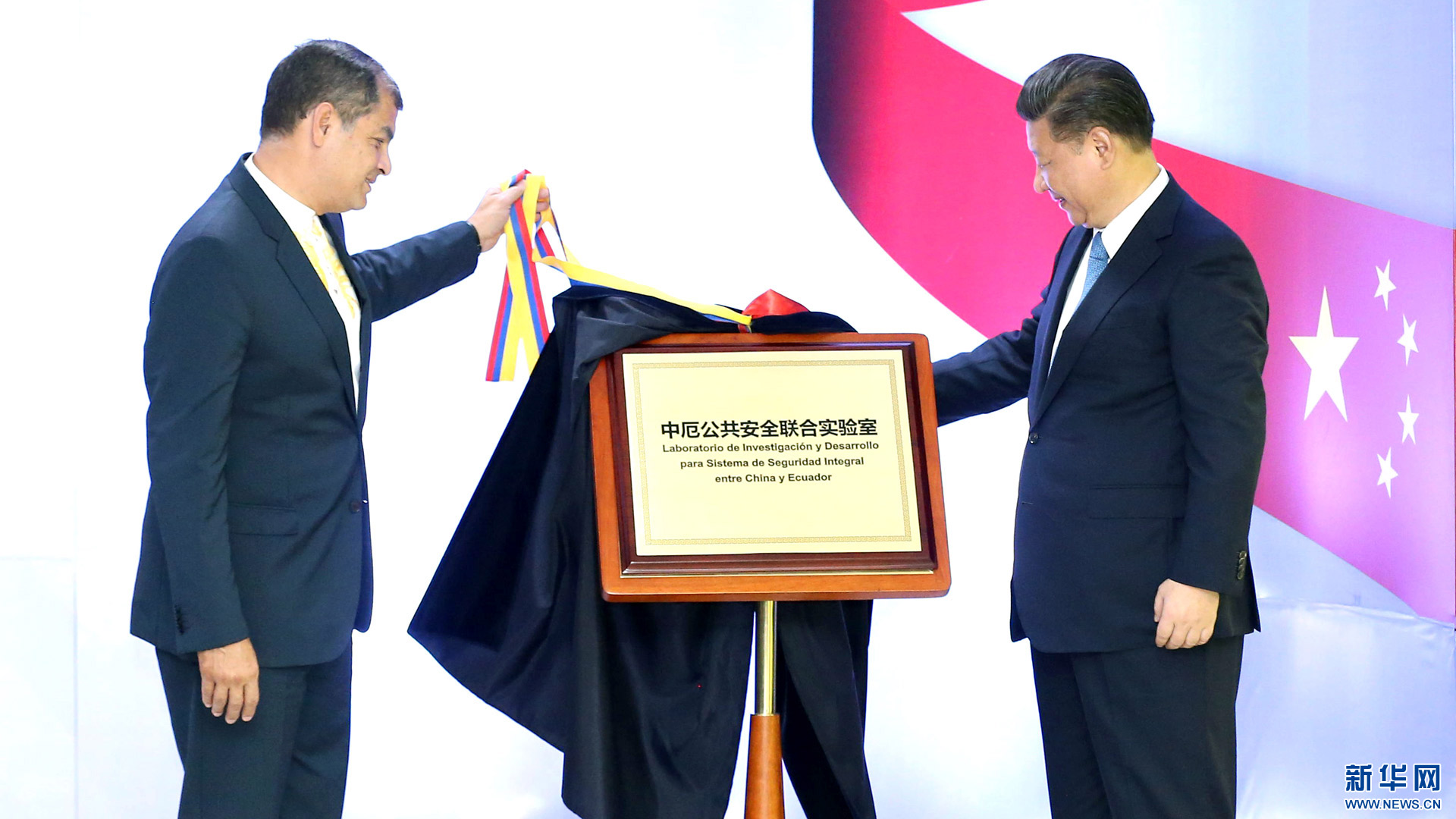 當地時間11月18日,國家主席習近平在基多同厄瓜多爾總統科雷亞共同出席中方援建的厄瓜多爾公共安全應急指揮中心聯合實驗室揭牌儀式,喬內醫院奠基、科卡科多-辛克雷水電站竣工發電視頻連線活動。這是兩國元首共同為厄瓜多爾公共安全應急指揮中心聯合實驗室揭牌。新華社記者 馬占成 攝2016-11-19