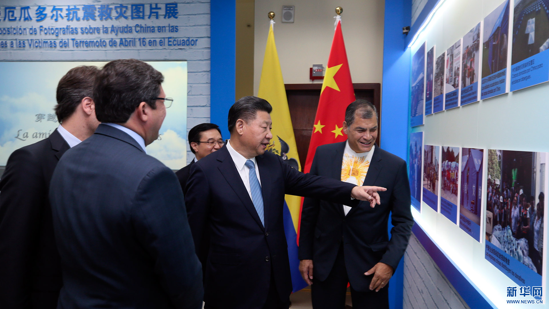 當地時間11月18日,國家主席習近平在基多同厄瓜多爾總統科雷亞共同出席中方援建的厄瓜多爾公共安全應急指揮中心聯合實驗室揭牌儀式,喬內醫院奠基、科卡科多-辛克雷水電站竣工發電視頻連線活動。這是兩國元首共同參觀中方支援厄瓜多爾抗震救災圖片展。新華社記者 蘭紅光 攝2016-11-19