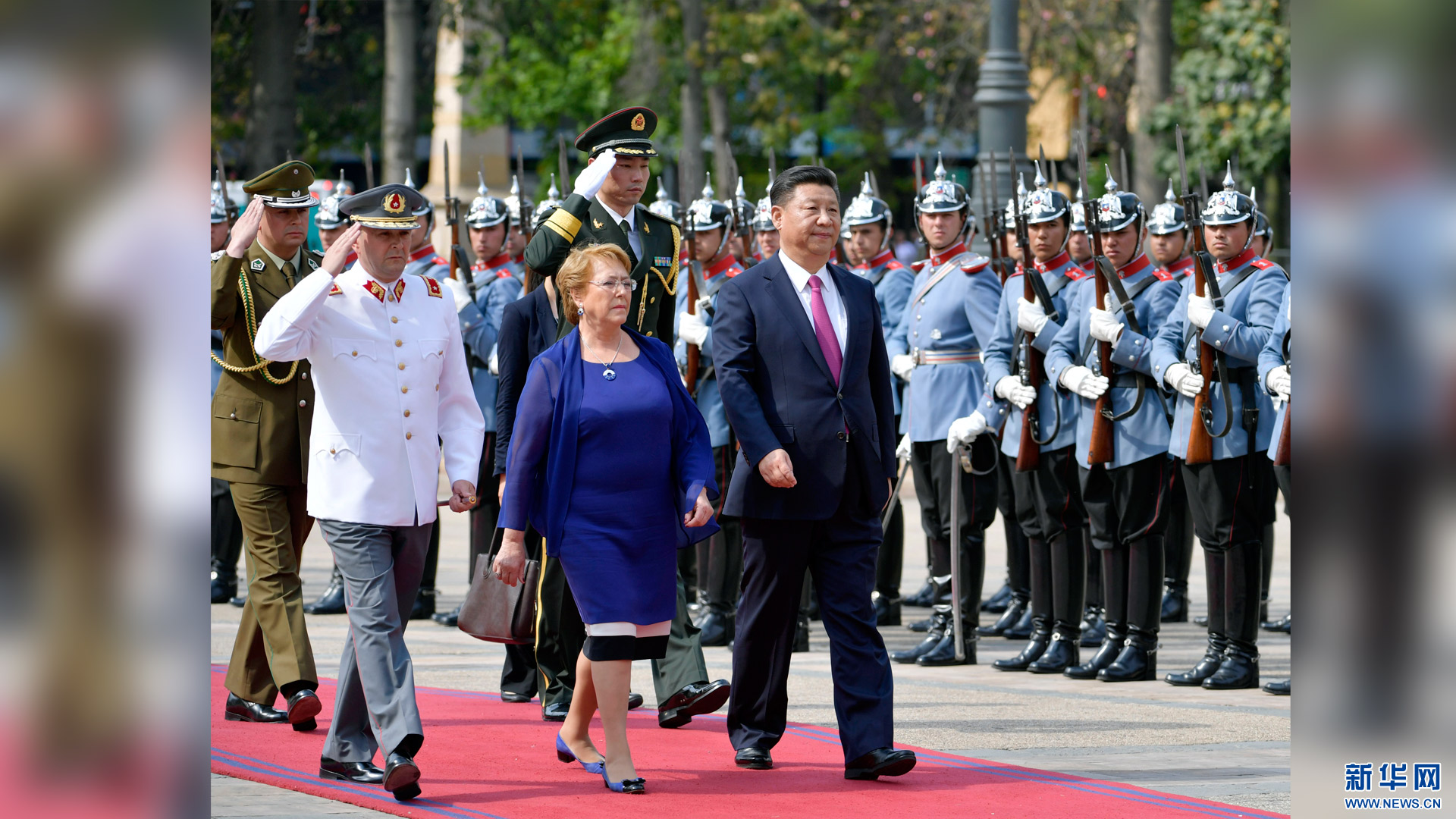 11月22日,國家主席習近平在圣地亞哥同智利總統巴切萊特舉行會談。這是會談前,習近平出席巴切萊特在憲法廣場舉行的隆重歡迎儀式。新華社記者 王曄 攝2016-11-23