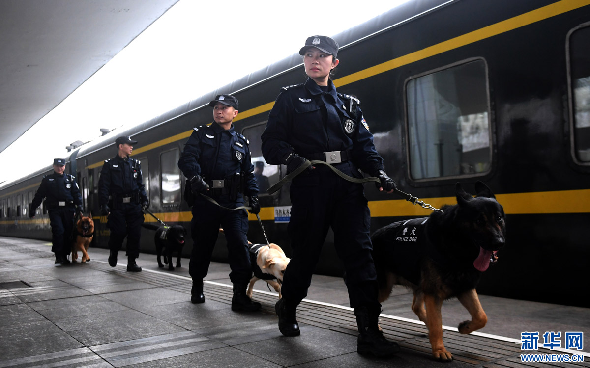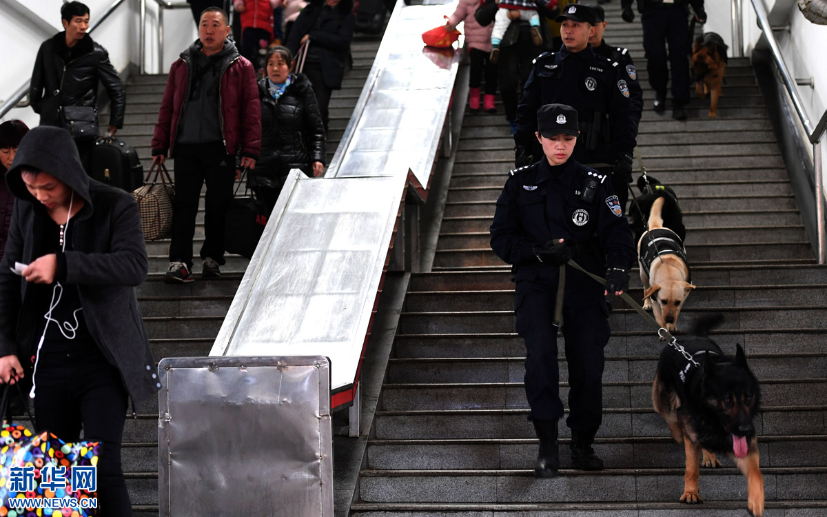 2月5日,劉慧(前)帶著“威利”和隊友在襄陽火車站巡邏。新華社記者 程敏 攝
