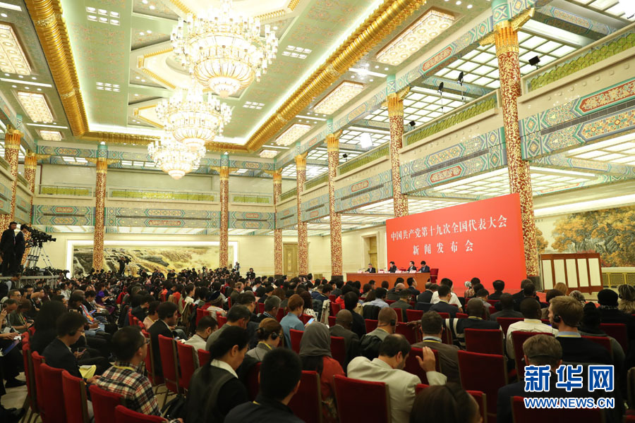 2017年10月17日下午,中國共產黨第十九次全國代表大會新聞發言人在人民大會堂三樓金色大廳舉行新聞發布會,并回答中外記者提問。圖為新聞發布會現場。新華網 翟子赫 攝