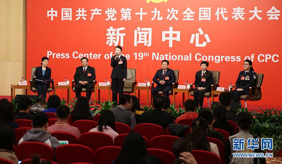 ??? 10月19日,十九大新聞中心舉辦集體采訪,邀請政法戰線代表談全面推進依法治國。圖為采訪現場。新華網 郝廣鵬攝