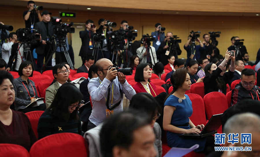 ??? 10月19日,十九大新聞中心舉辦集體采訪,邀請工信和通訊領域代表談走新型工業化道路。圖為采訪現場。新華網 郝廣鵬攝
