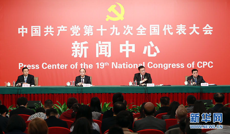 10月21日,十九大新聞中心舉辦記者招待會(huì),邀請(qǐng)中共中央統(tǒng)戰(zhàn)部常務(wù)副部長(zhǎng)張裔炯、副部長(zhǎng)冉萬祥,中共中央對(duì)外聯(lián)絡(luò)部副部長(zhǎng)郭業(yè)洲介紹黨的統(tǒng)一戰(zhàn)線工作和黨的對(duì)外交往情況,并回答記者提問。圖為記者招待會(huì)現(xiàn)場(chǎng)。新華網(wǎng) 郝廣鵬攝