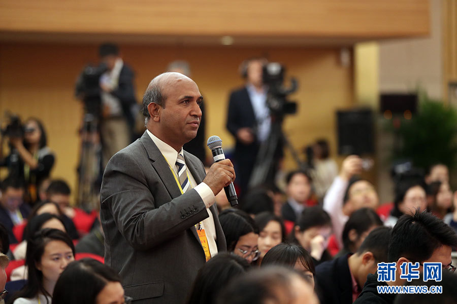 10月21日,十九大新聞中心舉辦記者招待會(huì),邀請(qǐng)中共中央統(tǒng)戰(zhàn)部常務(wù)副部長(zhǎng)張裔炯、副部長(zhǎng)冉萬(wàn)祥,中共中央對(duì)外聯(lián)絡(luò)部副部長(zhǎng)郭業(yè)洲介紹黨的統(tǒng)一戰(zhàn)線工作和黨的對(duì)外交往情況,并回答記者提問。圖為巴基斯坦聯(lián)合通訊社記者提問。新華網(wǎng) 郝廣鵬攝