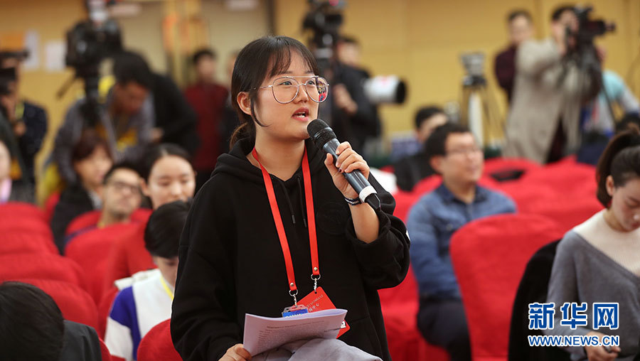10月22日,十九大新聞中心在梅地亞中心二層新聞發(fā)布廳舉辦集體采訪活動,邀請教育領域代表談“教育綜合改革”。圖為人民日報記者提問。新華網(wǎng) 郝廣鵬攝
