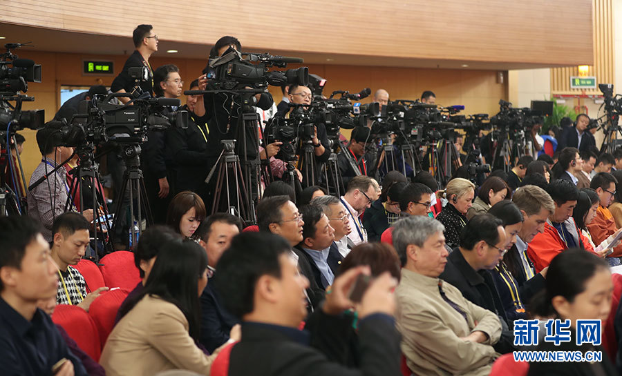 10月23日,十九大新聞中心舉辦記者招待會,邀請中央財經領導小組辦公室副主任楊偉民,環境保護部黨組書記、部長李干杰介紹踐行綠色發展理念,建設美麗中國有關情況,并回答記者提問。圖為現場記者。新華網 郝廣鵬攝