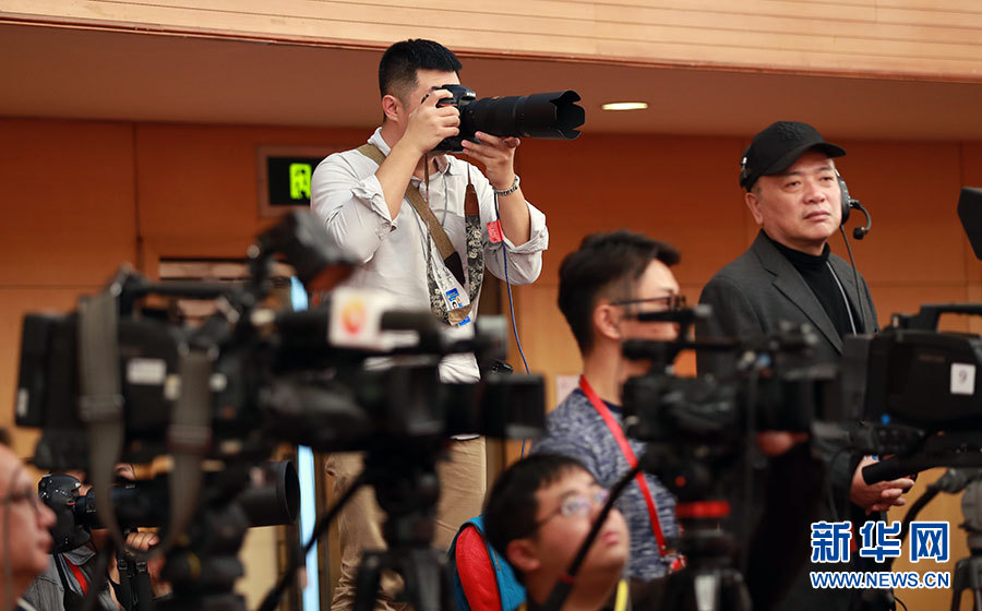 10月23日,十九大新聞中心舉辦集體采訪活動,主題為“打好生態環保攻堅戰”。圖為現場記者。新華網 郝廣鵬攝
