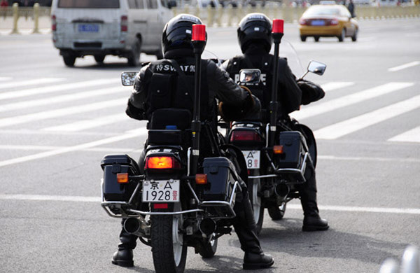 3月1日,特警隊員在人民大會堂東門外巡邏。十一屆全國人大第四次會議、全國政協(xié)十一屆四次會議即將開幕。