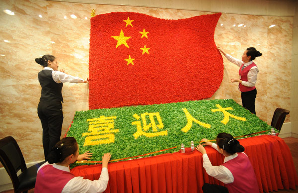 3月2日,京西賓館的服務(wù)員用絹花拼出國旗和“喜迎人大”的圖案。當(dāng)日,為了迎接全國人大代表入住,京西賓館的服務(wù)員自發(fā)設(shè)計,并從市場上采購來絹花,在餐廳拼出組合圖案,表達(dá)“喜迎人大”的心情。