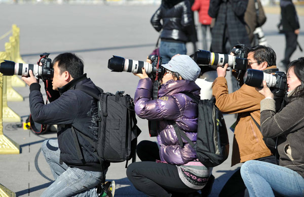 3月3日,4名攝影記者蹲在地上拍照。當(dāng)日,中國人民政治協(xié)商會議第十一屆全國委員會第四次會議在北京人民大會堂開幕。