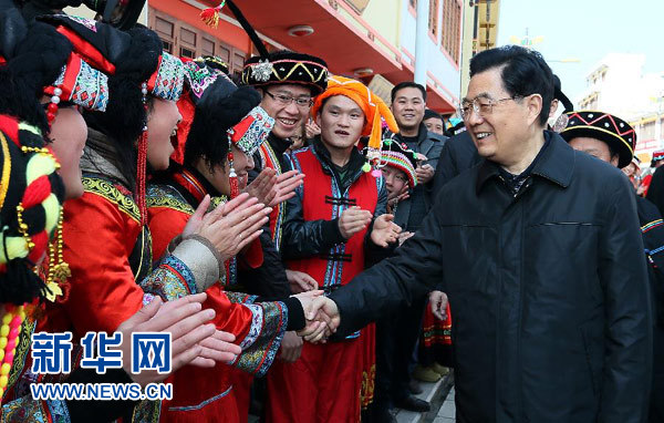 ????12月1日至6日,國家主席胡錦濤在貴州考察工作。這是胡錦濤在畢節市普底彝族小鎮向各族群眾親切致意。 新華社記者 鞠鵬 攝