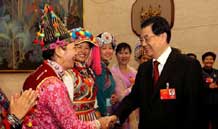 胡錦濤等黨和國家領導人走進會場,來到身著民族盛裝的少數民族代表、委員們中間,同大家親切握手,互致問候。
