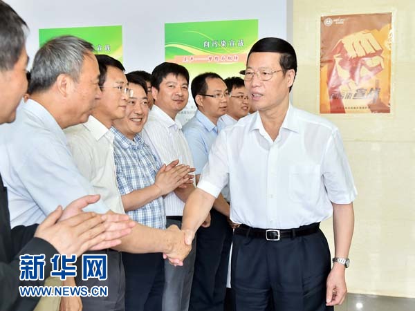??? 6月5日,中共中央政治局常委、國務(wù)院副總理張高麗到中國環(huán)境科學研究院和中國環(huán)境監(jiān)測總站調(diào)研。這是張高麗與科技工作者親切握手交談。新華社記者 李濤 攝