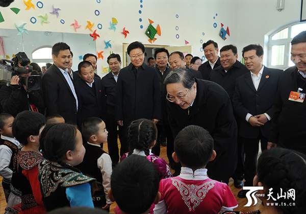 俞正聲仔細聽取新村牧民定居建設情況介紹,走進新村幼兒園送上益智玩具等幼教器具,觀看教學點雙語教學,與小朋友們一起拍手唱兒歌《小兔兒乖乖》,聽二年級學生朗誦童謠《我的家鄉也拉曼》,氣氛幸福溫暖。