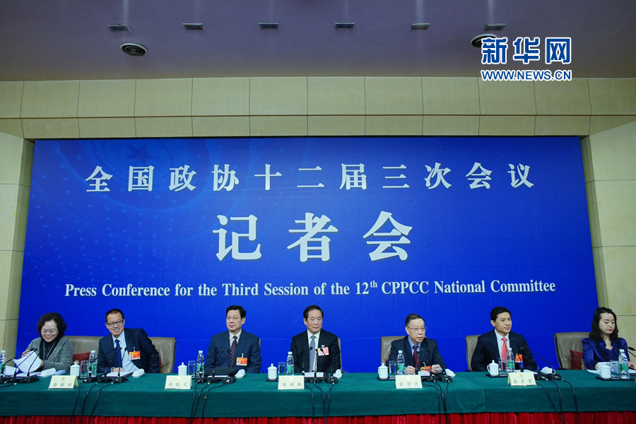 ?? 全國(guó)政協(xié)十二屆三次會(huì)議舉行記者會(huì),邀請(qǐng)全國(guó)政協(xié)常委朱維群、黃潔夫和全國(guó)政協(xié)委員胡曉義、李彥宏、俞敏洪等談促進(jìn)民生改善與社會(huì)和諧穩(wěn)定,并回答記者提問。圖為記者會(huì)現(xiàn)場(chǎng)。新華網(wǎng)/中國(guó)政府網(wǎng)?郭小天 攝