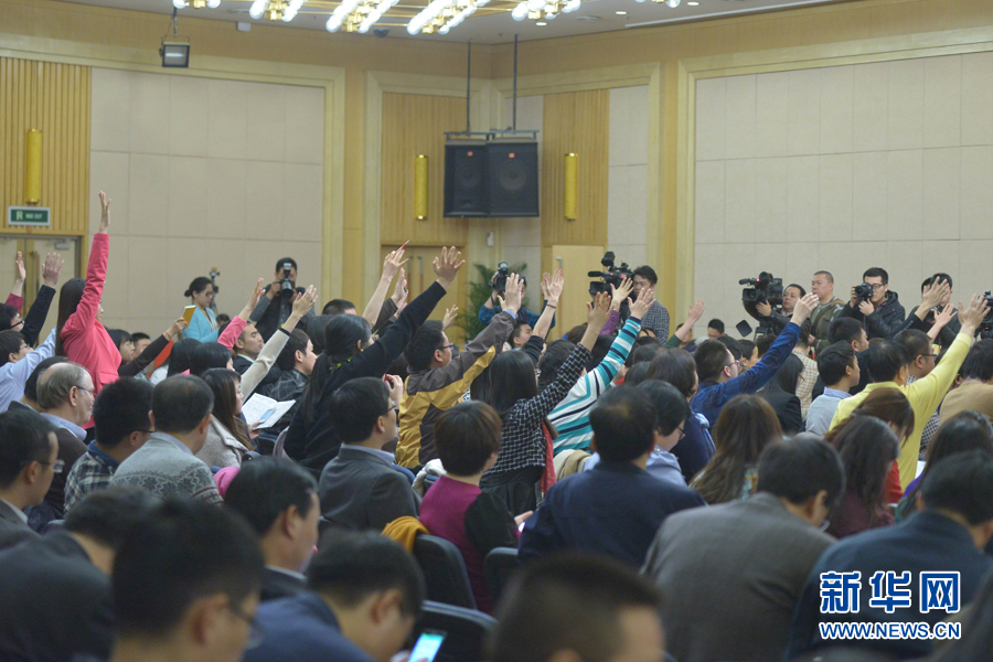 ??? 十二屆全國人大三次會(huì)議新聞中心于3月11日10時(shí)45分舉行記者會(huì),邀請(qǐng)科技部部長萬鋼就科技改革與發(fā)展回答中外記者提問。圖為現(xiàn)場(chǎng)記者舉手提問。新華網(wǎng)/中國政府網(wǎng) 郭小天 攝