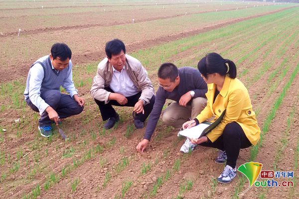 2015年11月,王輝(左二)與團隊人員考察小麥出苗情況。王輝供圖