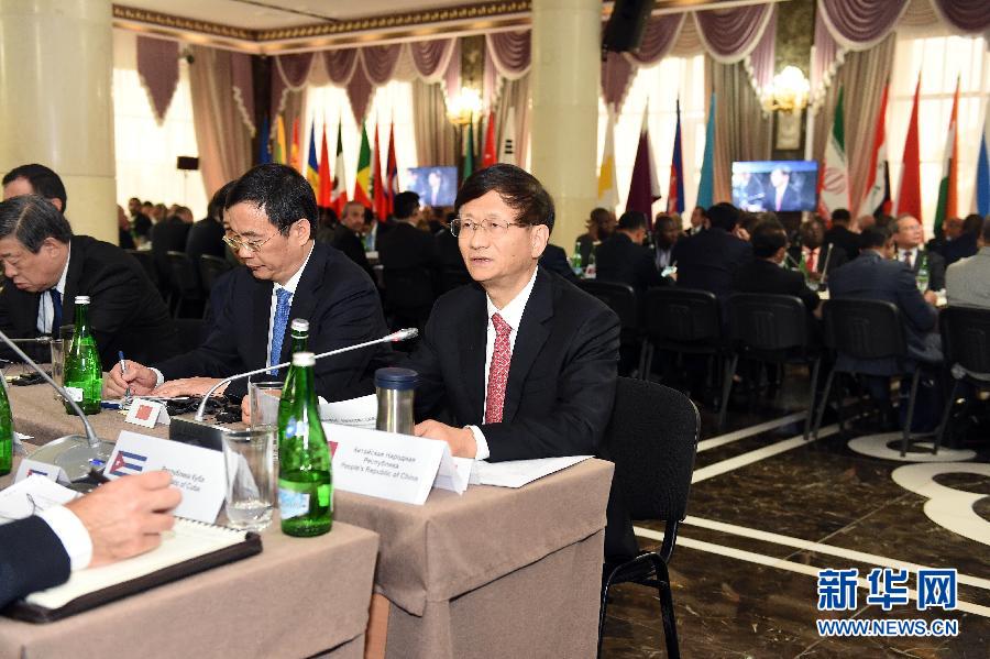 ??? 5月24日,在俄羅斯車臣共和國(guó)首府格羅茲尼,中共中央政治局委員、中央政法委書記孟建柱(前右一)在第七屆安全事務(wù)高級(jí)代表國(guó)際會(huì)議上發(fā)言。中共中央政治局委員、中央政法委書記孟建柱24日在俄羅斯車臣出席第七屆安全事務(wù)高級(jí)代表國(guó)際會(huì)議。來(lái)自70余個(gè)國(guó)家和國(guó)際組織的代表就深化國(guó)際安全合作、有效應(yīng)對(duì)恐怖主義等問(wèn)題進(jìn)行探討。新華社發(fā)(郝帆攝)