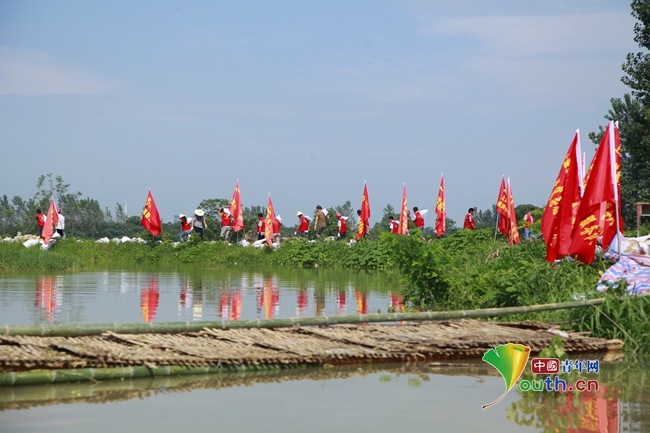 團旗在堤壩上飄揚。中國青年網記者 周學磊 攝