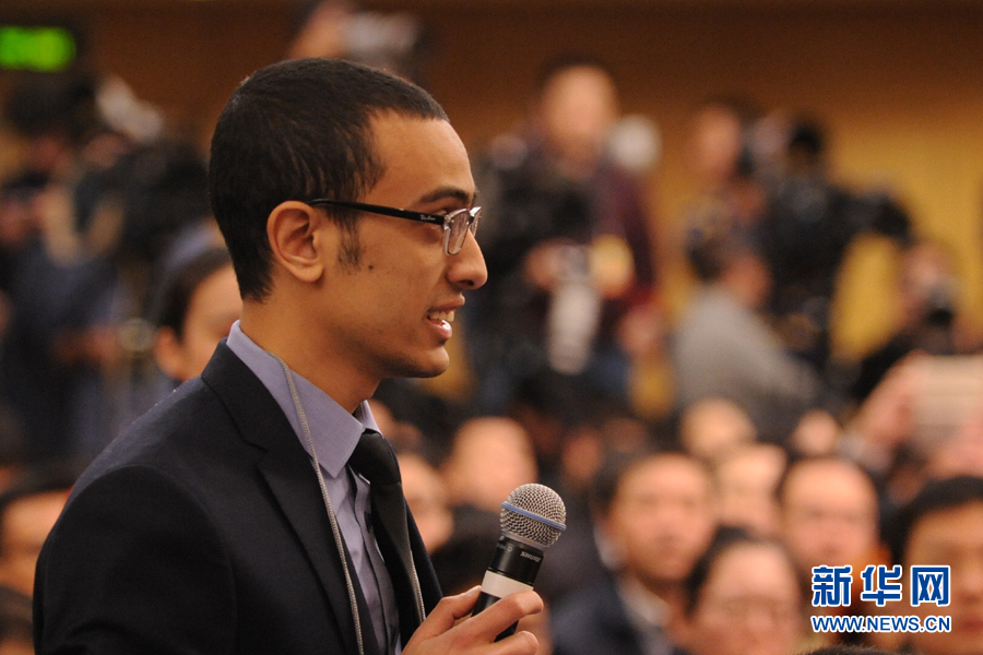 十二屆全國人大四次會議新聞中心于3月8日(星期二)10時在梅地亞中心多功能廳舉行記者會,邀請外交部部長王毅就“中國的外交政策和對外關系”的相關問題回答中外記者的提問。圖為埃及七日報記者提問。新華網/中國政府網記者 陳杰 攝