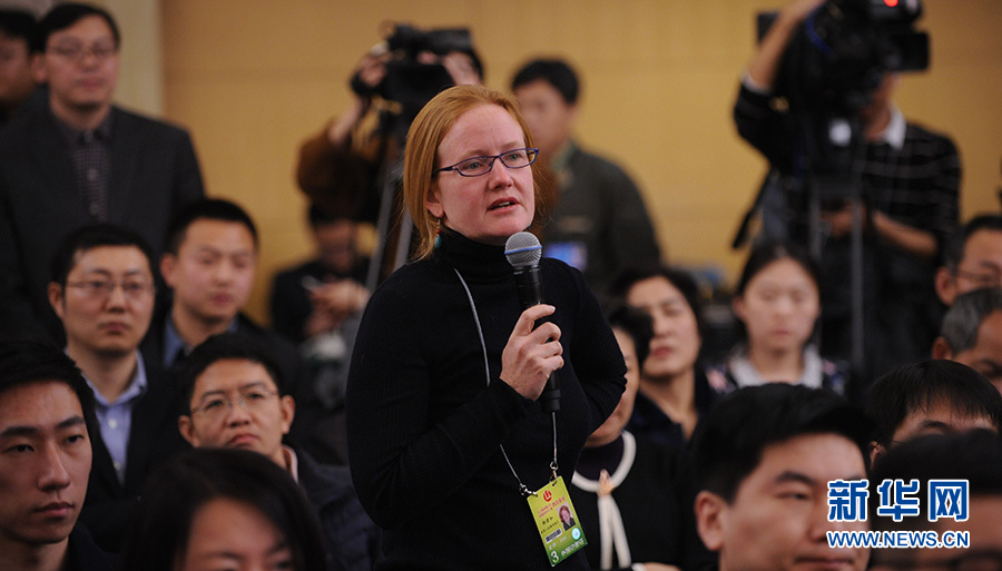 ?????十二屆全國人大四次會議新聞中心于3月12日(星期六)14時30分在梅地亞中心多功能廳舉行記者會,邀請國務院國有資產監督管理委員會主任肖亞慶、副主任張喜武、副主任黃丹華和副秘書長、新聞發言人彭華崗就“國企改革”的相關問題回答中外記者的提問。圖為金融時報記者提問。新華網/中國政府網 陳杰 攝