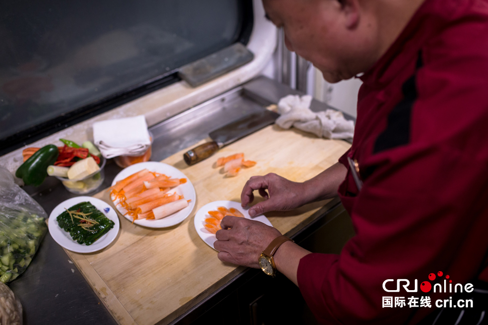 “有一名旅客,差不過每年春運都會坐這趟車從杭州出發前往海寧然后轉乘高鐵前往寧波,為的就是在我們車上吃一頓飯?!卑讕煾嫡f。圖為白師傅制作菜品。