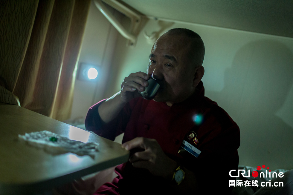 晚上11點多,大部分旅客已進入夢鄉,白振慶師傅終于可以回到休息室稍作調整,但只能小睡幾個小時,凌晨4點白師傅還要起來為旅客準備早飯。白師傅血壓偏高,每天晚上都要吃藥進行控制。