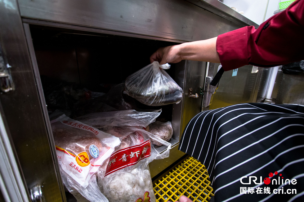 隨旅客一起啟程的還有幾十斤蔬菜、蒸好的兩屜米飯、幾條活魚和一些鮮蝦。在這14個小時的旅途中,廚師長白振慶和他的老搭檔將用這些食材,在只有幾平米的廚房內盡可能烹調出可口的菜肴。圖為白振慶師傅檢查備品情況。