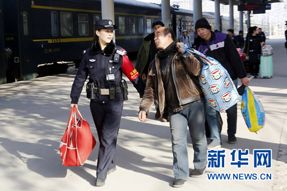 2月12日,侯馬站派出所民警為進出站旅客提供幫助。 新華網 田明 攝