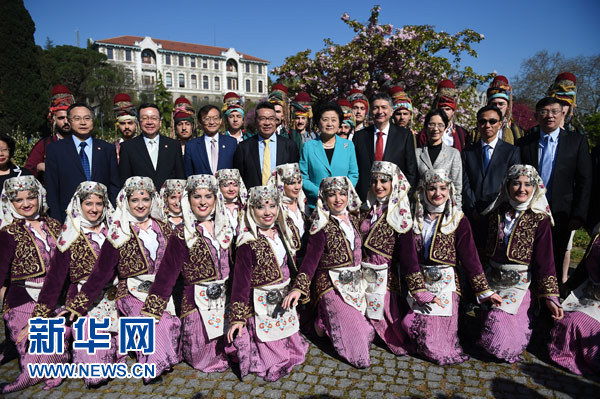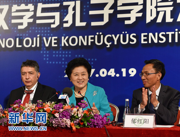 4月19日,中國國務(wù)院副總理劉延?xùn)|(中)在伊斯坦布爾考察土耳其海峽大學(xué)孔子學(xué)院并與部分土耳其漢學(xué)家和孔子學(xué)院師生代表座談。新華社記者賀燦鈴攝