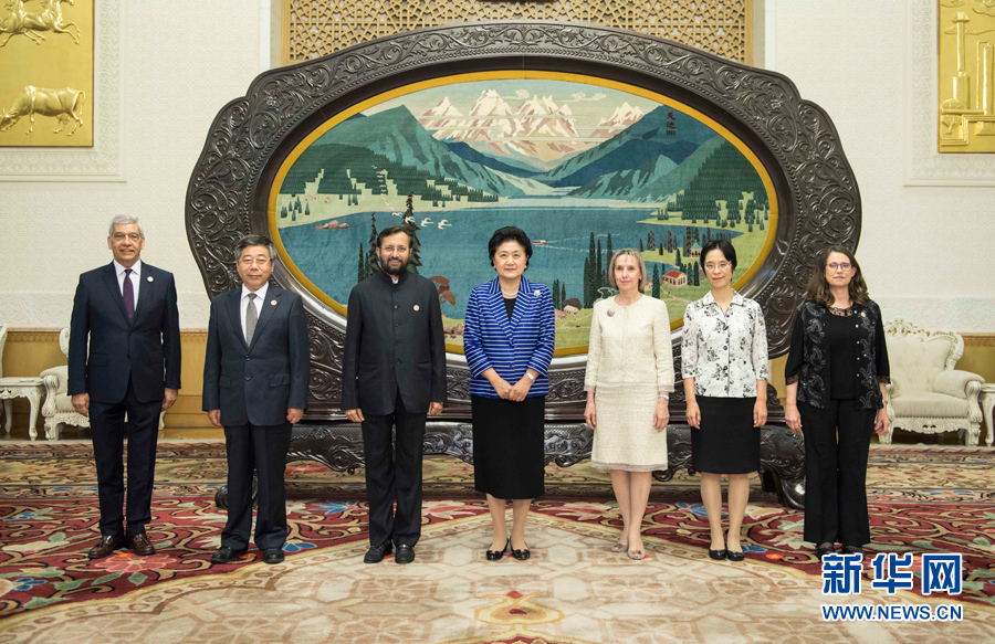 7月5日,國務院副總理劉延東在北京人民大會堂會見第五屆金磚國家教育部長會議外方代表團團長。 新華社記者 李濤 攝