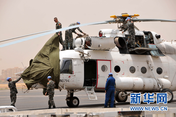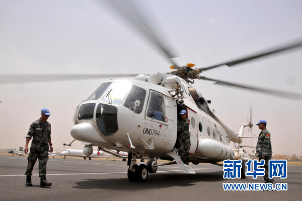今年6月11日、12日,中國空運先遣組24人搭乘裝載維和直升機的大型運輸機,分兩批次先后抵達喀土穆國際機場。據悉,首批直升機分隊配備了4架中型多用途直升機,主要擔負空中巡邏、戰場偵察、人員輸送、傷員轉運、物資運輸等任務。