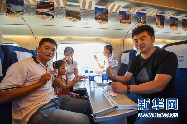8月3日,在呼和浩特東站開往烏蘭察布的列車上,乘客們在展示加蓋紀(jì)念印章的車票。新華社記者 連振 攝