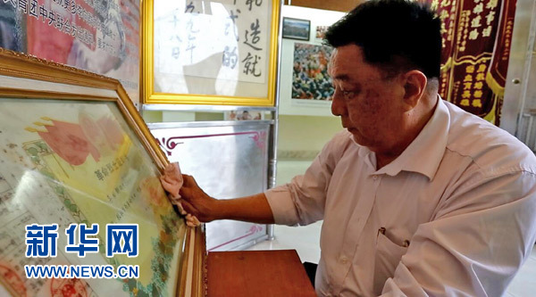 在海口市東山鎮(zhèn),李德清在家中擦拭兒子李向群的烈士證(2017年4月22日攝)。新華社發(fā)