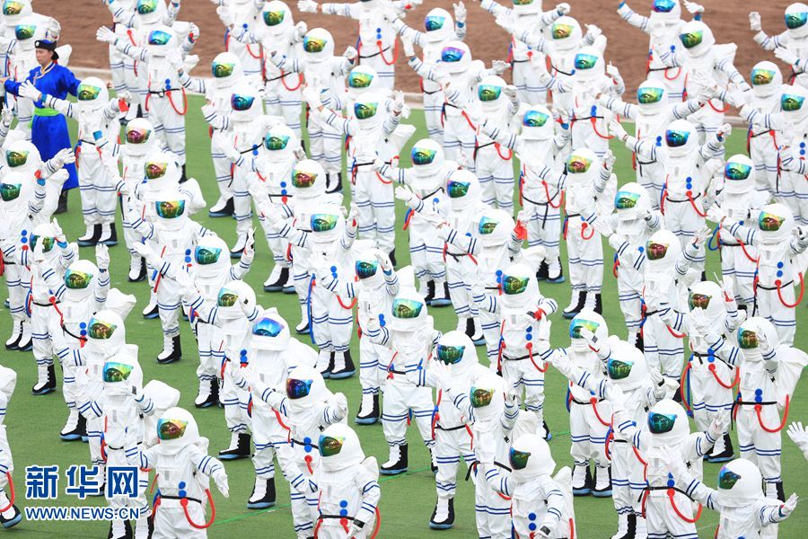 8月8日,內蒙古自治區成立70周年慶祝大會在呼和塔拉內蒙古少數民族群眾文化體育運動中心舉行。圖為群眾行進表演。新華網記者 陳杰 攝
