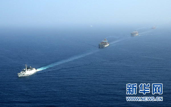 2009年1月6日,在中國海軍護航艦艇編隊武漢號導彈驅逐艦的帶領下,被護航的中國商船一字排開航行。 2009年4月28日,中國人民解放軍海軍第一批赴亞丁灣護航編隊,圓滿完成護航任務后返回海南三亞某軍港。由武漢號導彈驅逐艦、海口號導彈驅逐艦和微山湖號綜合補給艦組成的海軍首批護航編隊,在124個日夜里連續航行33000多海里,為41批166艘船舶實施了伴隨護航,為46艘船舶提供了區域護航,成功救援了3艘遇襲外國船只,安全、順利、圓滿地完成了護航任務。新華社發
