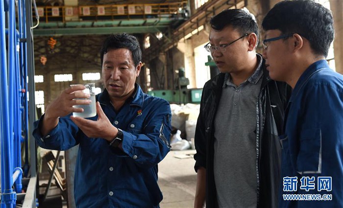 云南冶金昆明重工有限公司首席技師耿家盛(左)在車間里和助手查看生態環保廁所的沖水系統經過循環后的水質(9月22日攝)。新華社記者 藺以光 攝