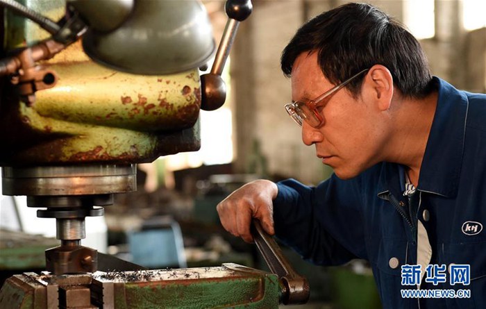 云南冶金昆明重工有限公司首席技師耿家盛在車間里操作銑床(2016年4月22日攝)。 新華社記者 藺以光 攝