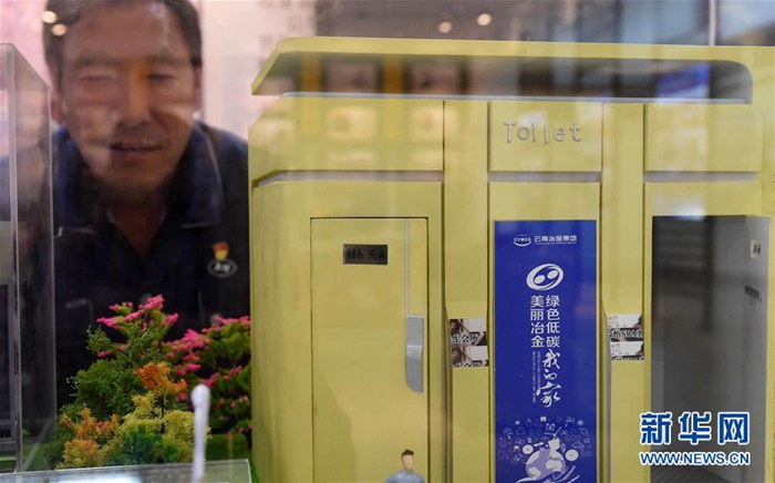云南冶金昆明重工有限公司首席技師耿家盛在他帶隊研發的生態環保廁所的模型前(9月22日攝)。新華社記者 藺以光 攝