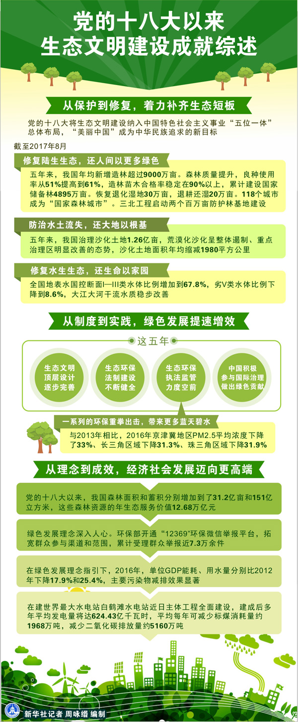 黨的十八大以來,在以習近平同志為核心的黨中央領導下,綠色發展、綠色生活理念深入人心,中國經濟社會發展更加充滿活力,生態文明建設推動中華民族在偉大復興征程中闊步前進。
