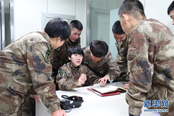 11月2日,黨的十九大代表、吉林省軍區數據信息室助理工程師張燕兵(中)來到吉林省軍區綜合訓練隊宣講十九大精神。新華社發(屈雷宇攝)