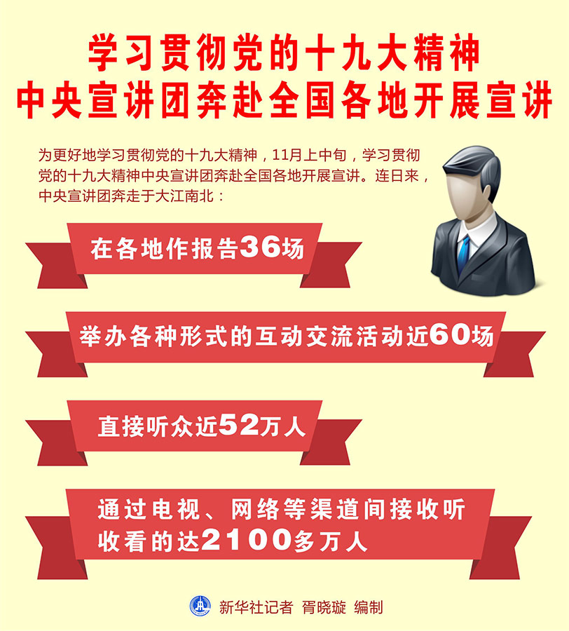 為更好地學習貫徹黨的十九大精神,11月上中旬,學習貫徹黨的十九大精神中央宣講團奔赴全國各地開展宣講。連日來,中央宣講團奔走于大江南北,在各地作報告36場,舉辦各種形式的互動交流活動近60場,直接聽眾近52萬人,通過電視、網絡等渠道間接收聽收看的達2100多萬人。