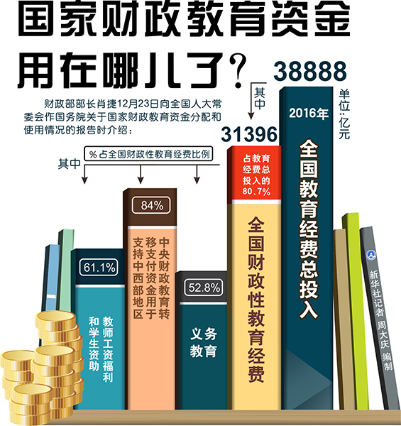 新華社北京12月23日電(記者胡浩郁瓊源)受國務院委托,財政部部長肖捷23日向全國人大常委會作國務院關于國家財政教育資金分配和使用情況的報告時介紹,2016年我國財政性教育經費一半以上用于義務教育,一半以上用于中西部地區并向農村傾斜,一半以上用于教師工資福利和學生資助。