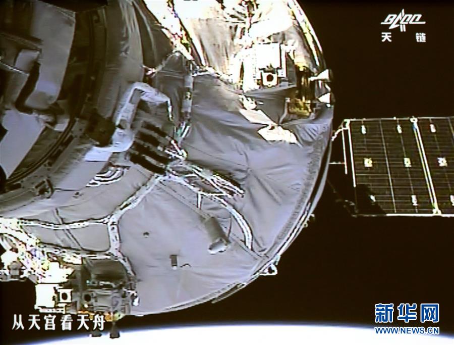 4月22日,北京航天飛行控制中心大廳大屏幕顯示天舟一號與天宮二號自動交會對接畫面。這是天舟一號與天宮二號進行的首次自動交會對接,也是我國自主研制的貨運飛船與空間實驗室的首次交會對接。(新華社發王泗江 攝)