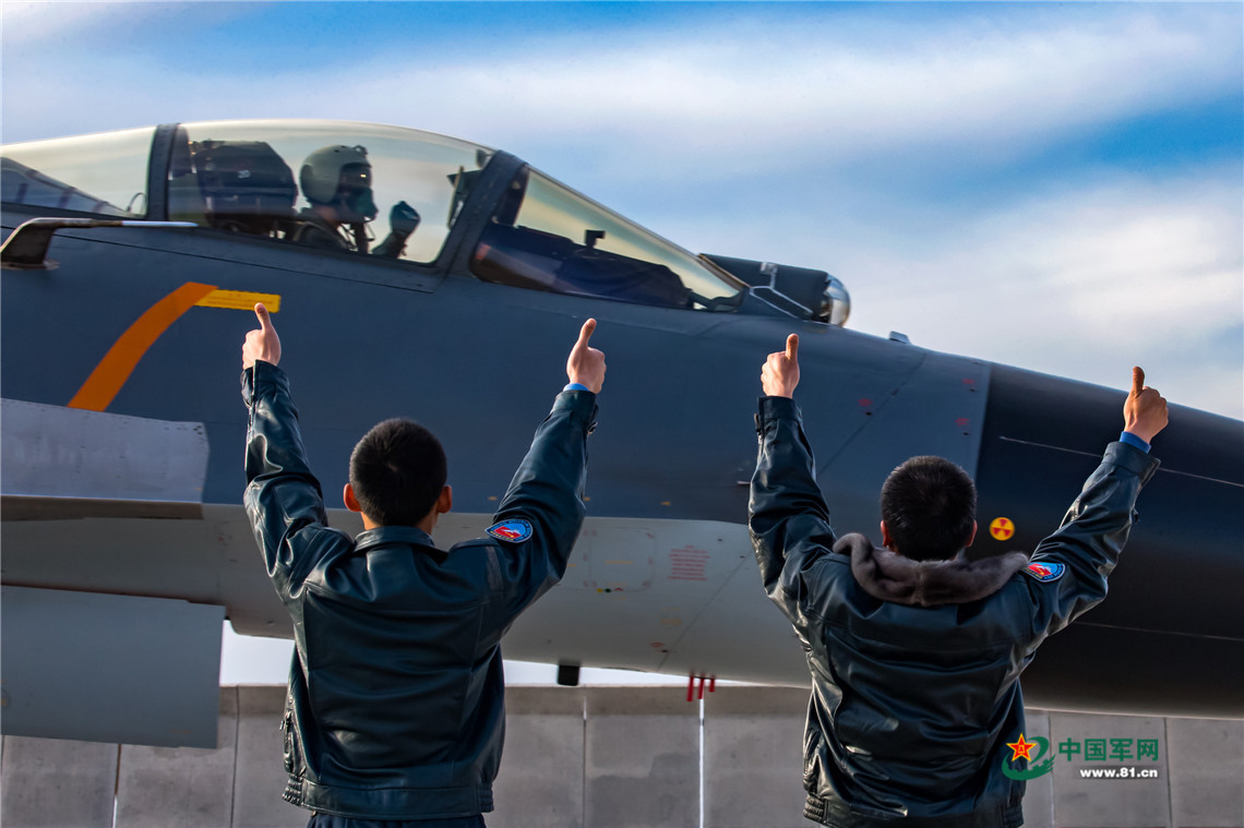 “金頭盔-2017”空軍對抗空戰競賽考核,戰機滑出,飛行員為戰友鼓勁加油。楊盼 攝影