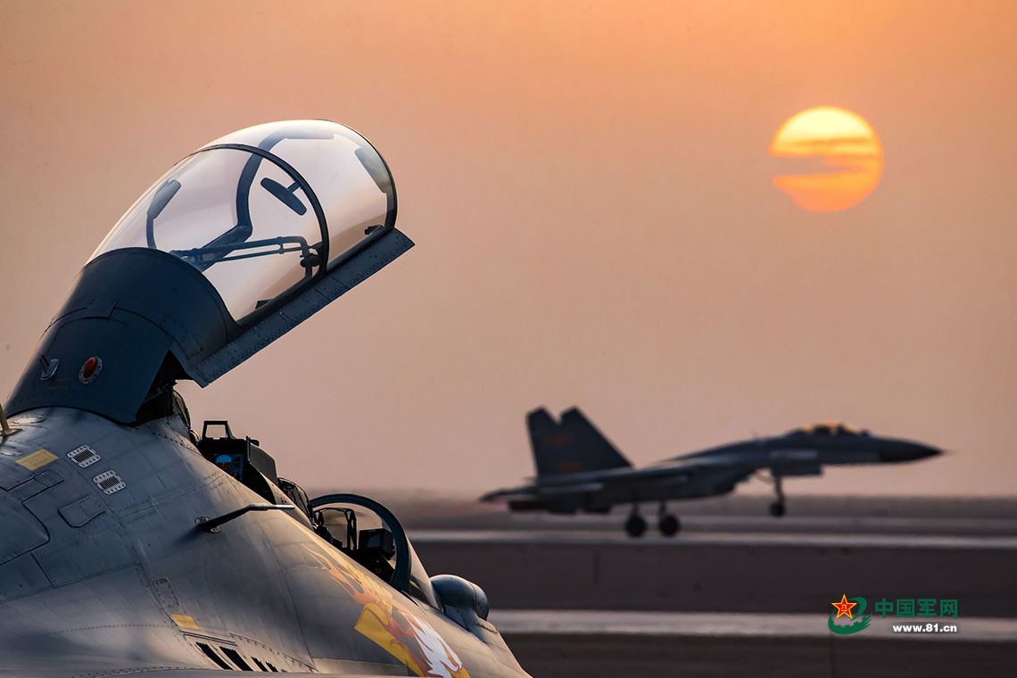 “金頭盔-2017”空軍對抗空戰競賽考核,旭日初升,戰機加力升空。楊盼 攝影