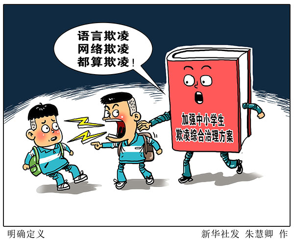 教育部教育督導(dǎo)局局長、國務(wù)院教育督導(dǎo)委員會(huì)辦公室主任何秀超介紹,在11部門聯(lián)合印發(fā)的方案中,首次對(duì)學(xué)生欺凌作出明確界定,指出中小學(xué)生欺凌是發(fā)生在校園內(nèi)外、學(xué)生之間,一方單次或多次蓄意或惡意通過肢體、語言及網(wǎng)絡(luò)等手段實(shí)施欺負(fù)、侮辱,造成另一方身體傷害、財(cái)產(chǎn)損失或精神損害等的事件。